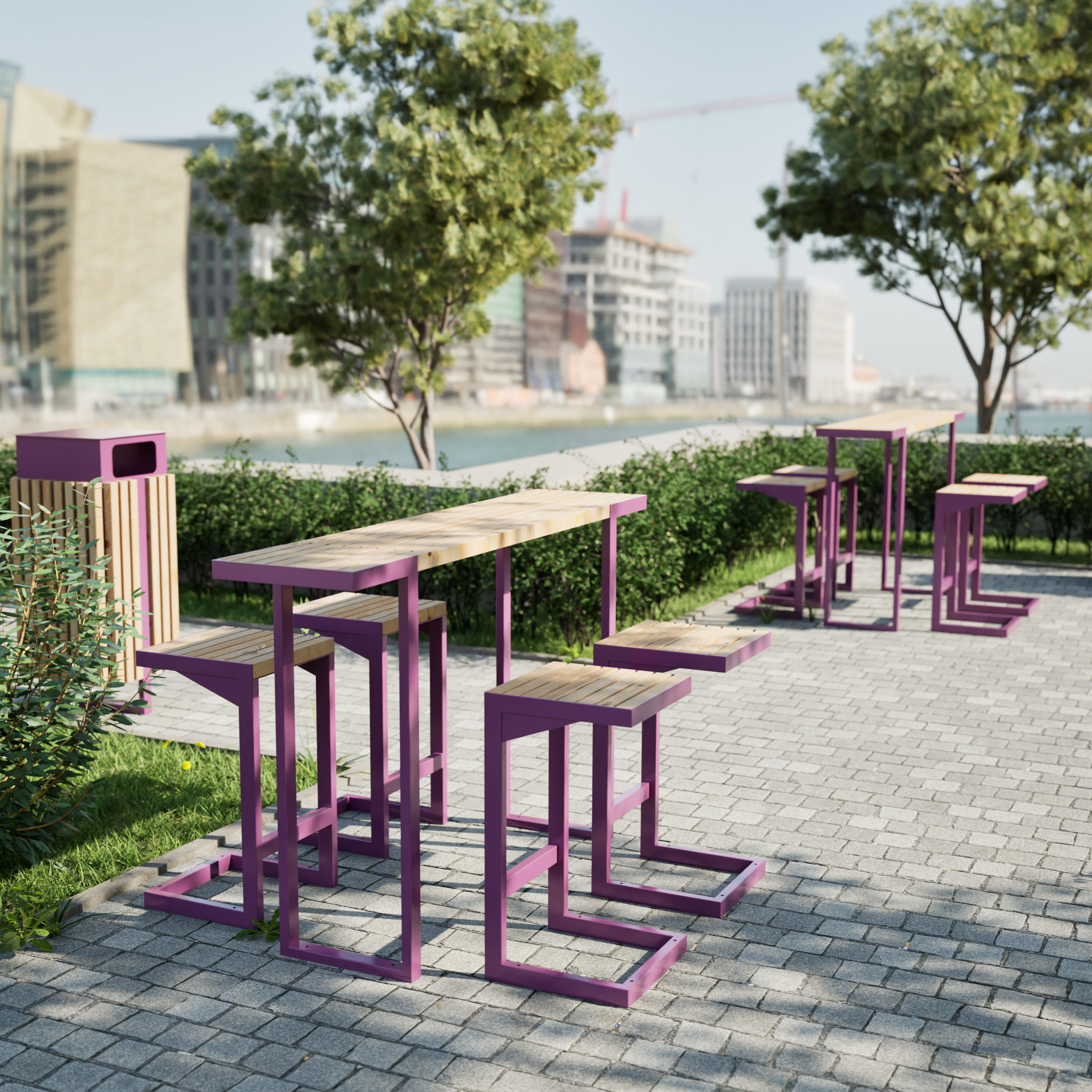 This minimalistic bar set from our Amager line is a stylish solution for restaurant and bar gardens, designed to ensure comfort of its users. Made of the highest quality larch wood and powder-coated steel, it provides durability as well as weather resistance. This bar set has been created inspired by Scandinavian architecture, combining functionality and high-quality finish with innovative, eye-catching design. The bar stools feature foot rests, which provide its users with both safety and comfort.