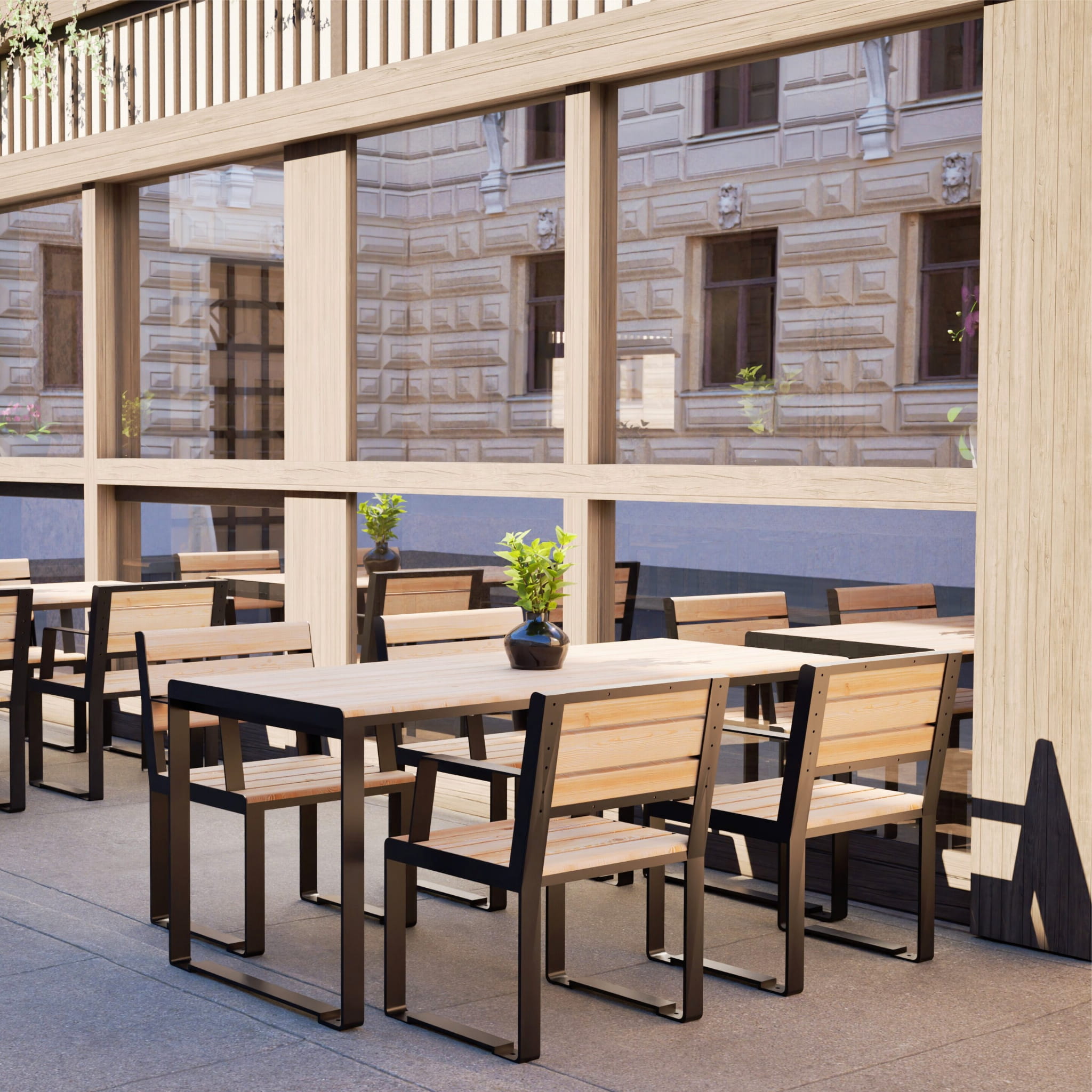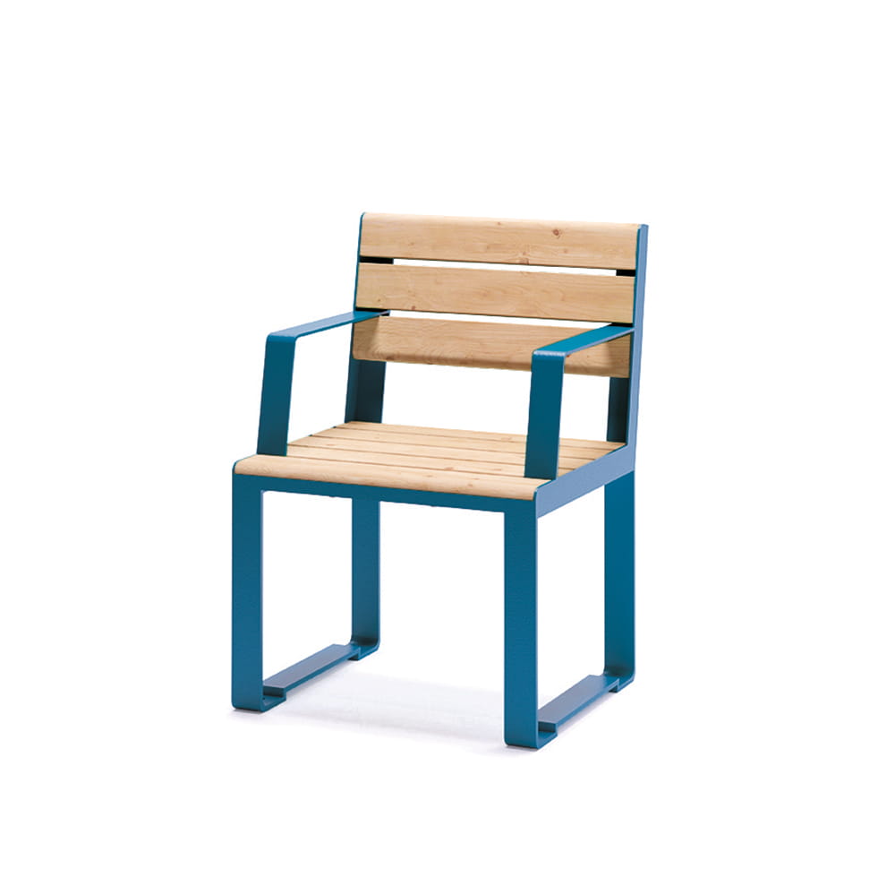 The innovative form of this chair from our Frederiksberg line will enhance all kinds of urban spaces. It will also perfectly match the remaining urban furniture from our line. Its Scandinavian-inspired design as well as the functionality will undoubtedly draw the attention of passers-by, becoming an essential element of small urban architecture. The armrests and bench base made of powder-coated steel provide both comfort of use and stability. The backrest and seat are made of high-quality larch wood.