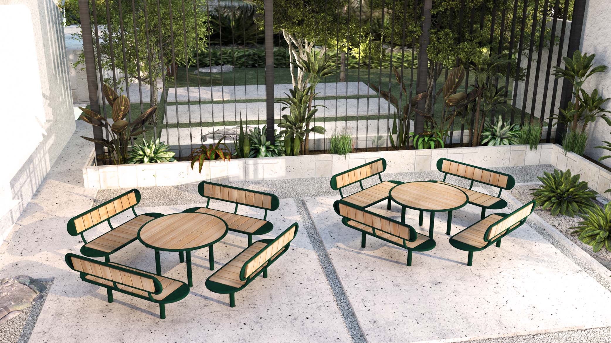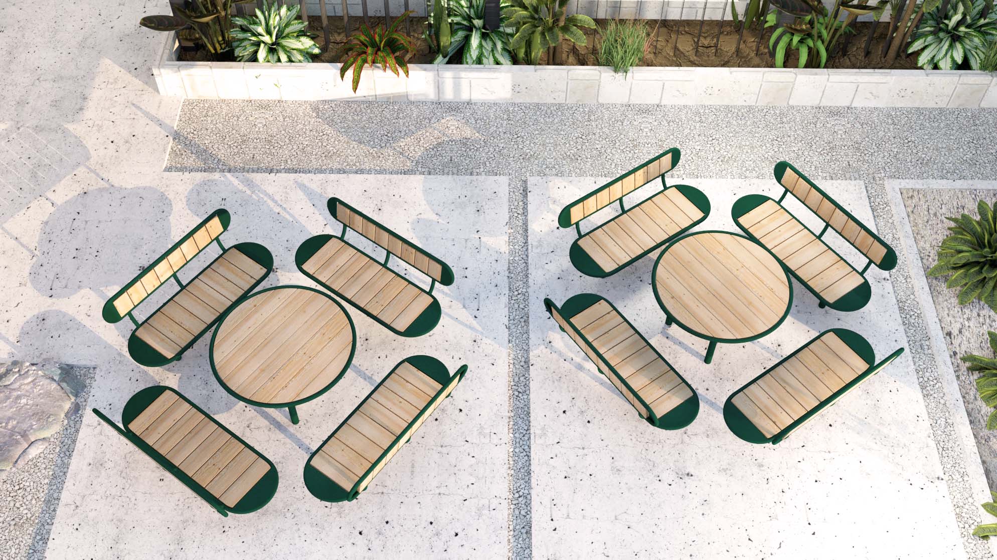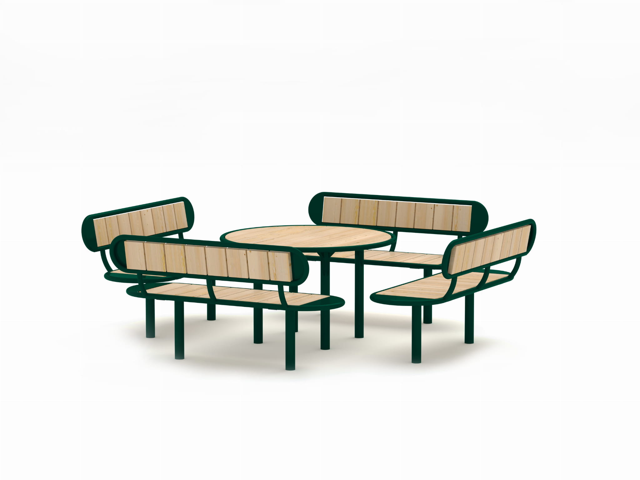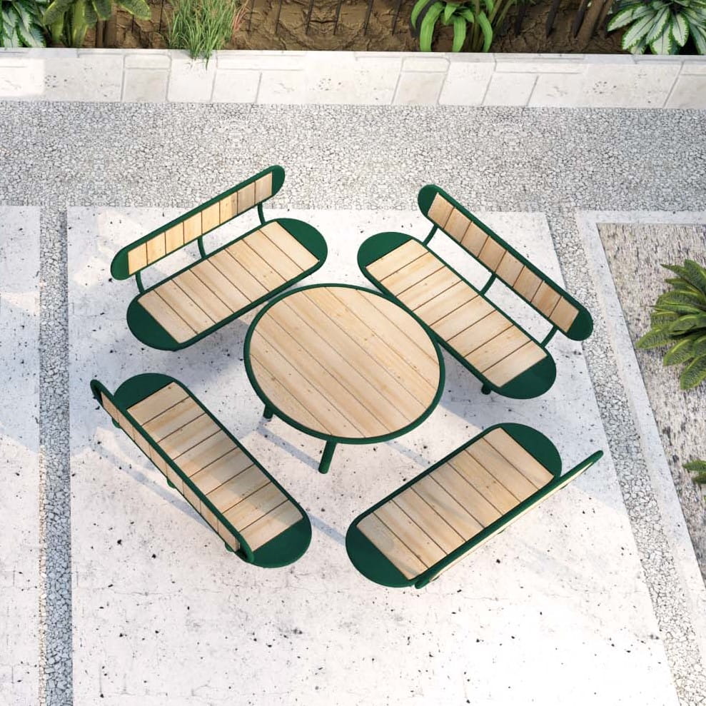 A modern outdoor set. The set consists of one round table and 4 benches. The furniture are made from steel and larch wood. The product is functional and provides seating even for 12 people. The metal construction can be powder coated with any colour from the available RAL palette (140 colours)