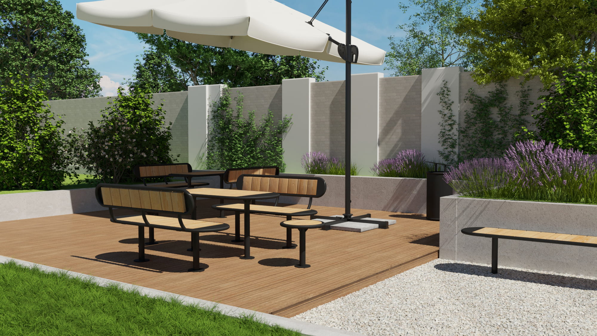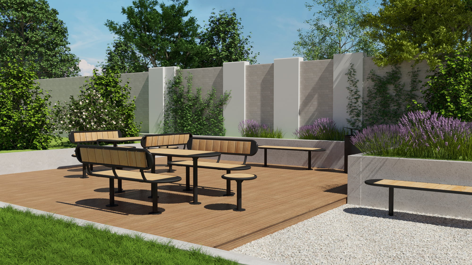 A modern outdoor set of one table, two benches and two bar stools. The urban furniture are made from steel and larch wood. The product is functional and provides seating even for 8 people. The metal construction can be powder coated with any colour from the available RAL palette (140 colours)