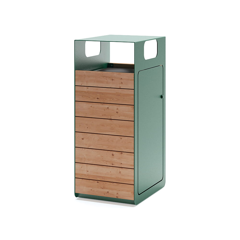 This waste bin from our Nørrebro line is a unique element of small architecture created for everyday use. With its modern form, it creates a coherent set with other elements of the line, allowing for numerous design possibilities. The practicality and accessibility of this waste bin is a great encouragement to keep the environment clean, while its minimalistic, Scandinavian-inspired design will blend in perfectly with any urban space. Made of larch wood and powder-coated steel, it ensures weather resistance and durability.